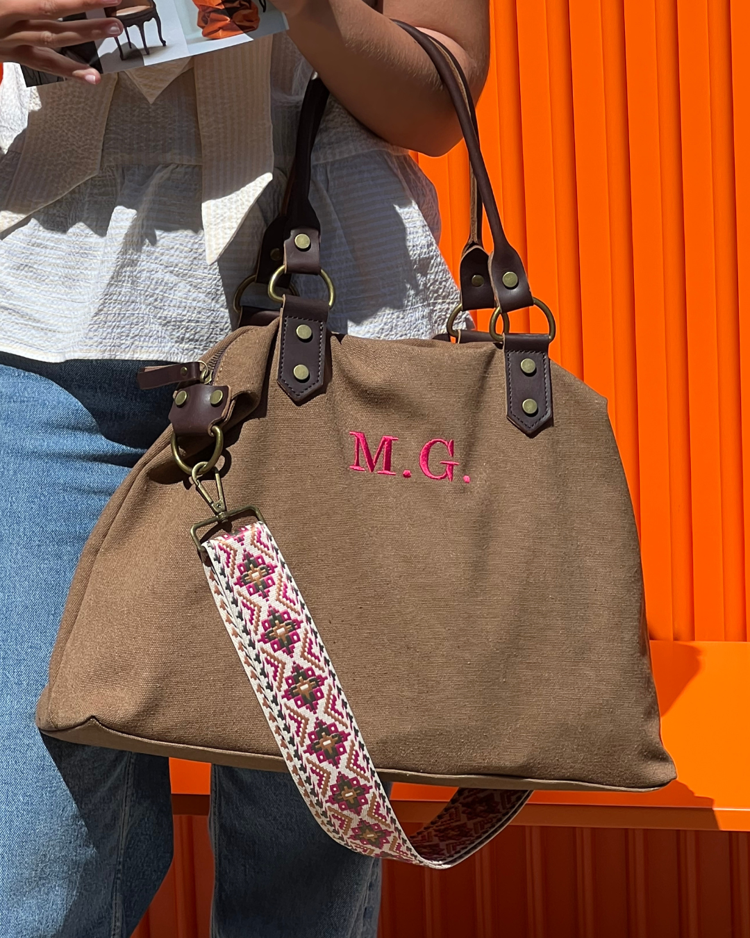 Confeccionado en loneta en color verde militar con asas en piel marrón chocolate. Un básico...
