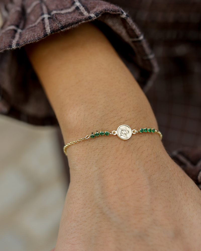 Pulsera que combina cadenita y riviere de circonita verde con charm de un ángel. Material:...