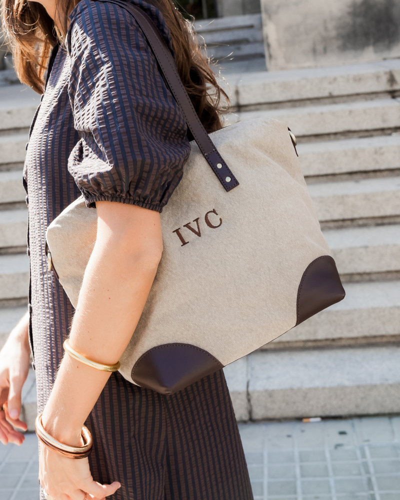 Confeccionado en loneta en color verde militar con asas en piel marrón chocolate. Un básico...