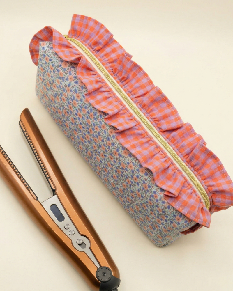 Mini fuchsia gingham fabric hair straightener bag with beige inner lining. With ruffle around the...