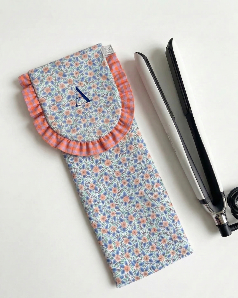 Hair straightener case made of blue floral fabric with matching inner lining. With ruffle around...