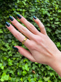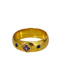 Thick ring with 3 zircons, two lilac and one navy blue central.