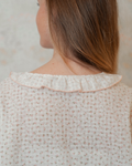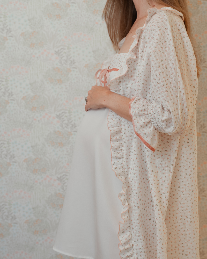 Its loose, wrap-around cut creates a relaxed silhouette. In keeping with the collection’s style, it features delicate details such as ruffles running the length of the robe, puffed sleeves finished with ruffles, and a cut that provides structure without stiffness, making it a standout piece. A garment designed for those seeking a special, comfortable and enveloping robe, ideal for everyday wear or special occasions such as a stay in hospital.