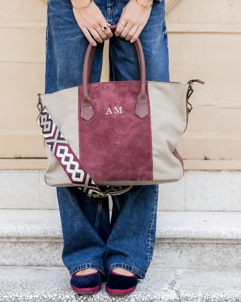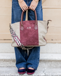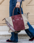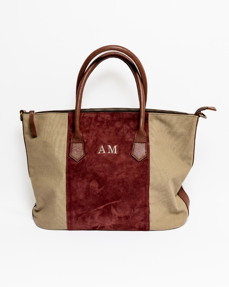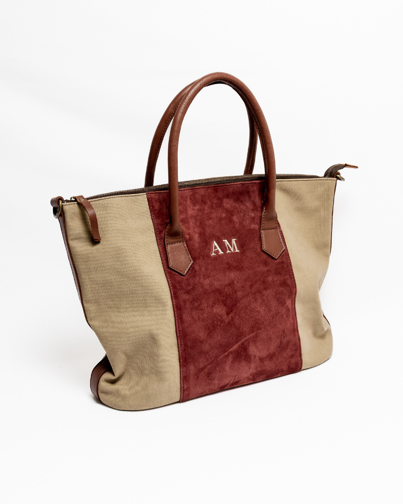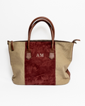 Made of taupe canvas with a maroon suede band down the middle of the front. Brown leather handles. A timeless staple that will never go out of style.