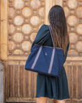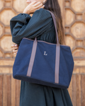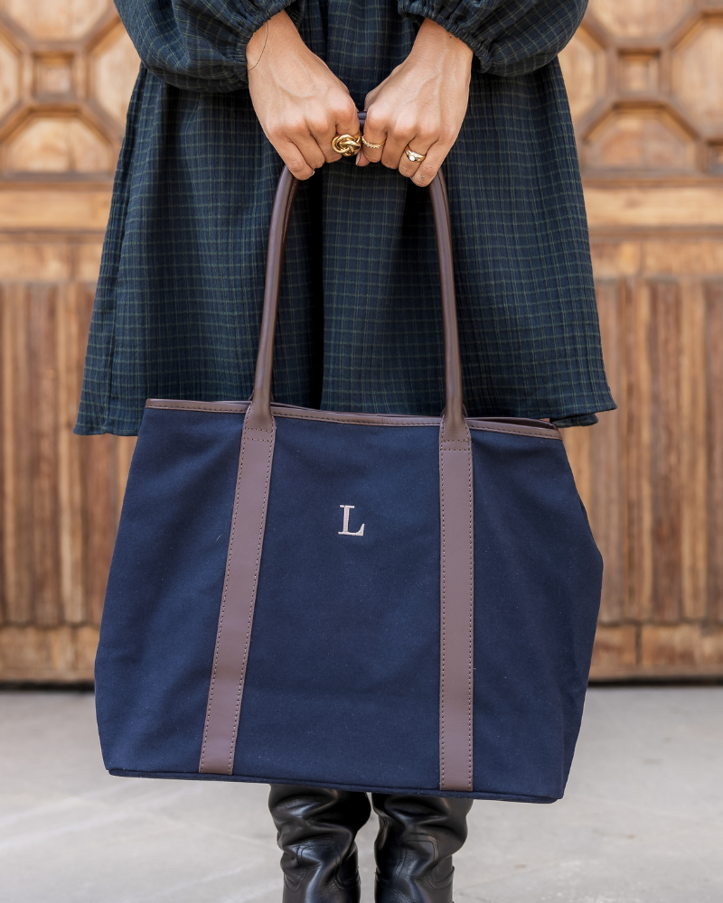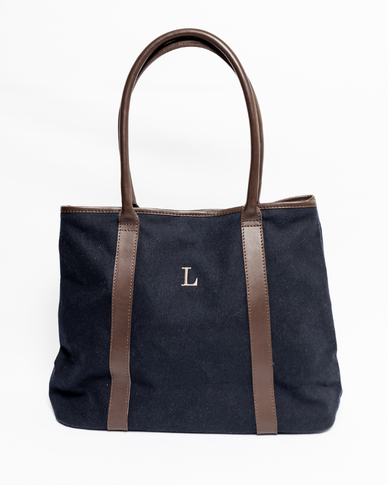 Made of navy blue canvas with chocolate brown leather handles. A timeless staple that will never go out of style.