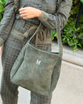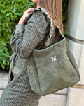 Satchel bag in kaki suede. Features an adjustable shoulder strap with a gold-tone buckle. Zip fastening. Black lining inside with zipped pocket. Large capacity. A timeless basic that will never go out of style.