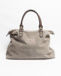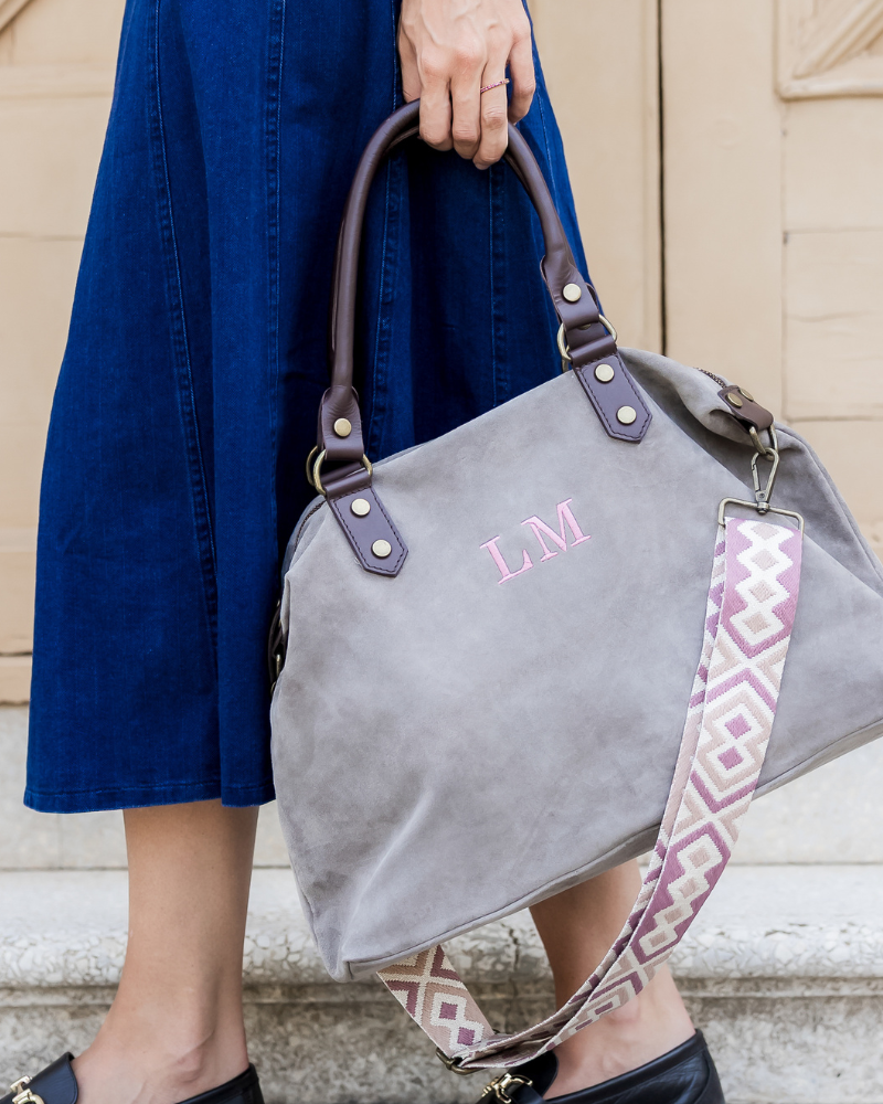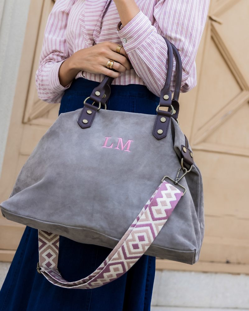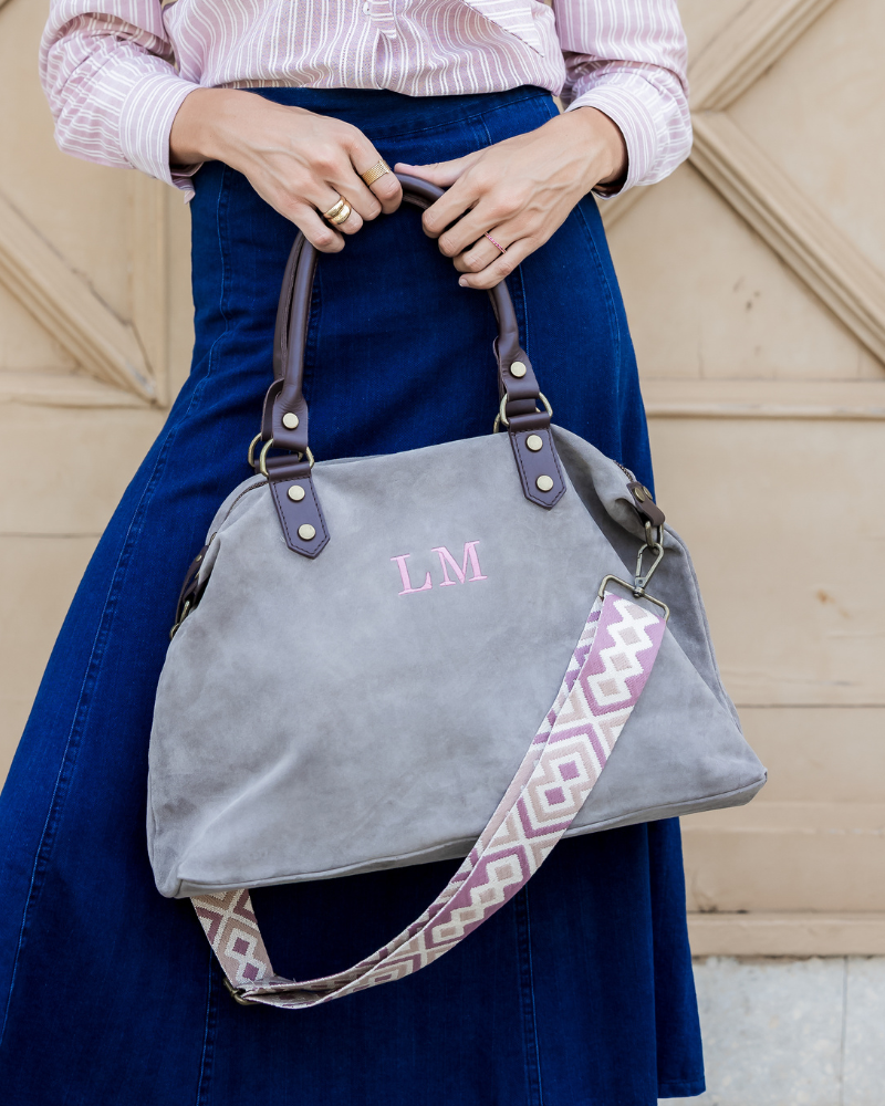Made of grey suede with chocolate brown leather handles. A timeless basic that will never go out of style.