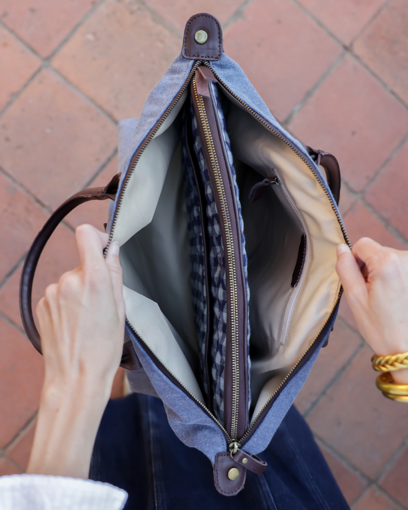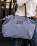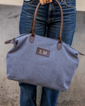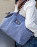 Made from blue canvas with chocolate brown leather handles. A timeless staple that will never go out of style.