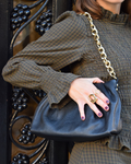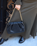 Medium-sized pouch bag made from high-quality black cowhide leather. The zip closure allows it to be completely closed and is as secure as you need it to be. You can carry it in your hand or over your shoulder/across your body thanks to its chain strap and long adjustable navy blue leather strap for added comfort.
