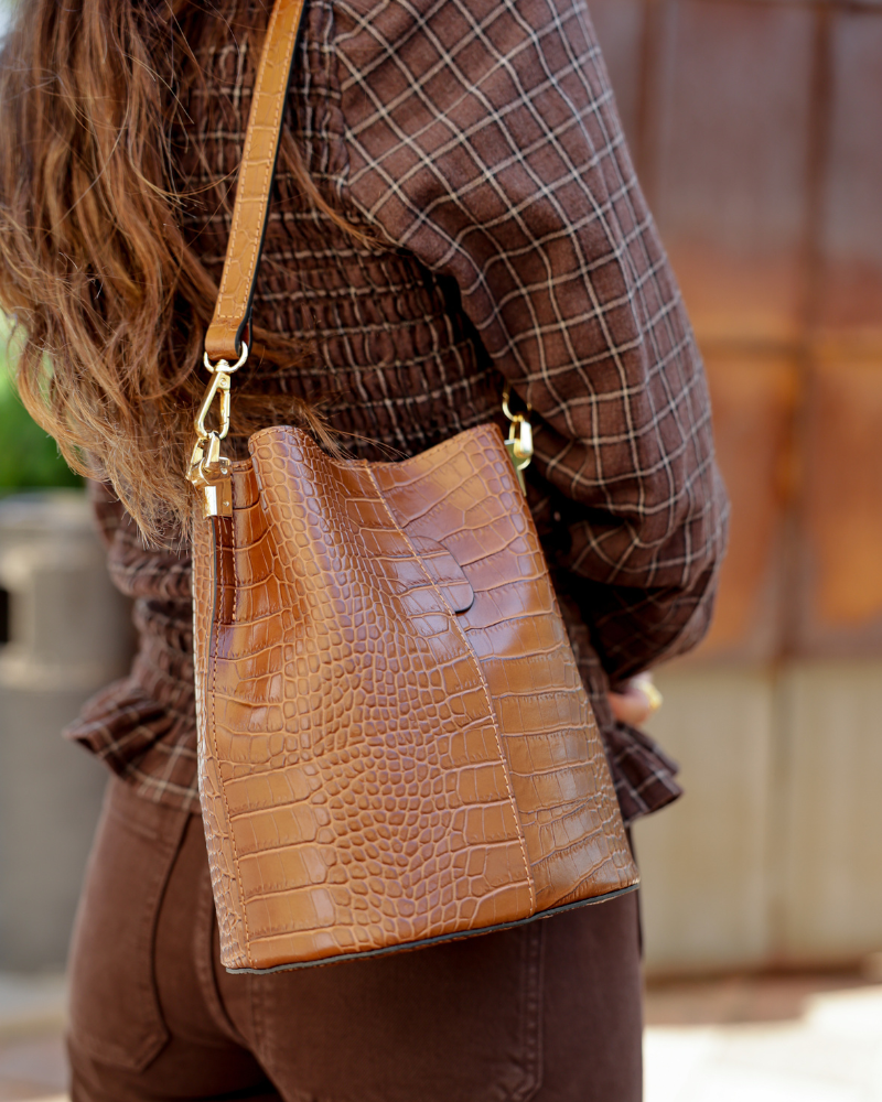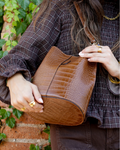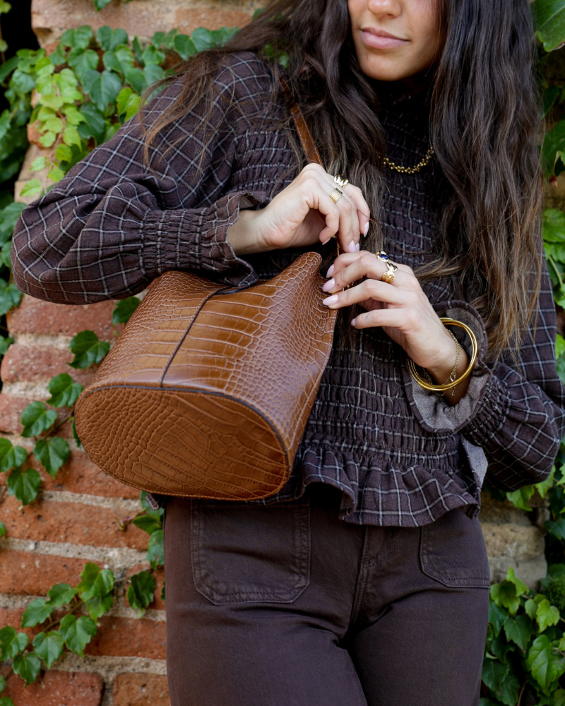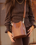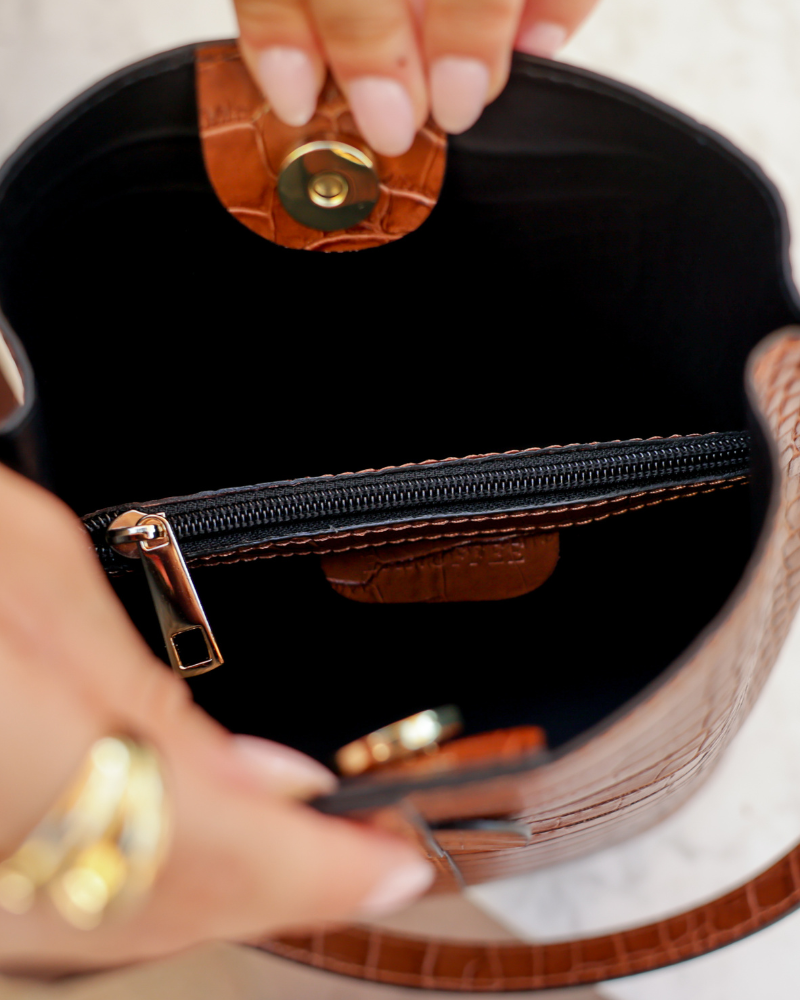 Sack-style bag made from high-quality calfskin in caramel brown. It has a hand strap and a shoulder/crossbody strap. Magnetic closure and interior bag with zip closure and two compartments on the sides. A timeless basic that will never go out of style.