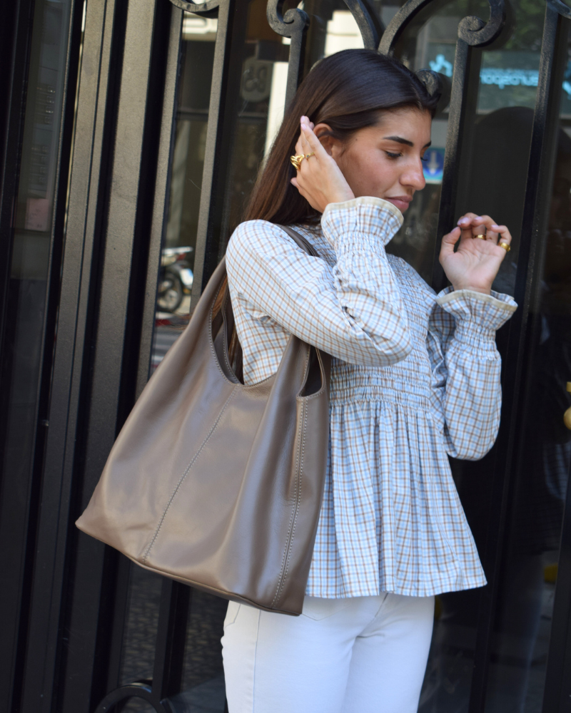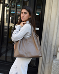 Medium-sized shopper bag made from high-quality taupe cowhide leather. The zip closure allows it to be completely closed and is as secure as you need it to be. It is fully lined and includes a zip pocket inside. You can carry it comfortably on your shoulder thanks to its double handle.