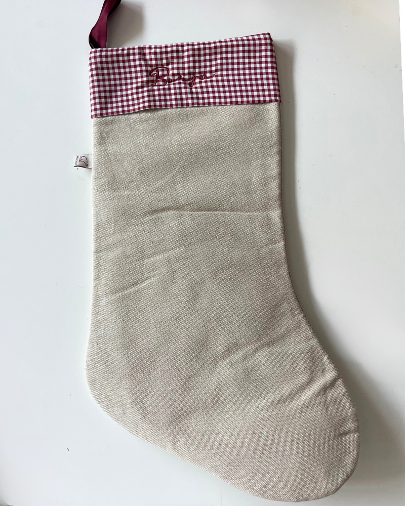Decorative Christmas ornament, made of personalised cotton, in the shape of a sock. Combined in two fabrics with a loop ribbon for hanging.