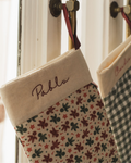 Personalised cotton Christmas decoration in the shape of a stocking. Made from two fabrics with a ribbon for hanging.