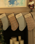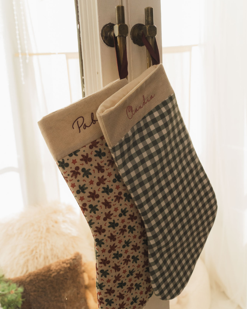 Personalised cotton Christmas decoration in the shape of a stocking. Made from two fabrics with a ribbon for hanging.