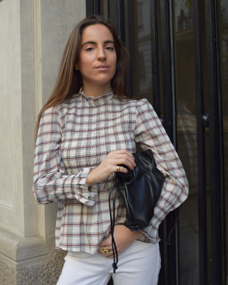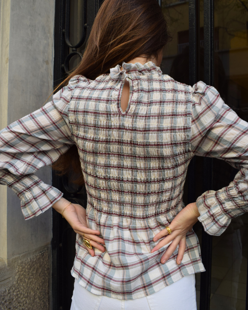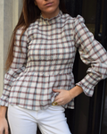 Checkered print shirt in a combination of neutral tones. Ruffled collar and puffed sleeves finished with gathering and ruffles. Gathering along the chest.