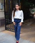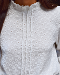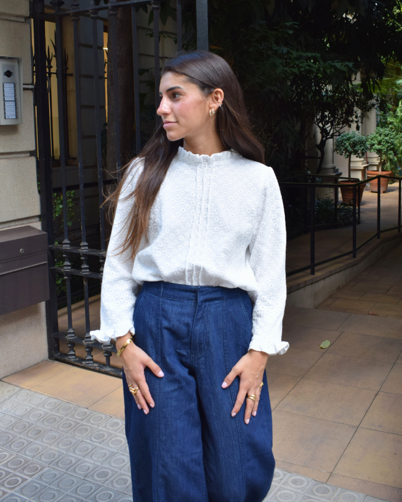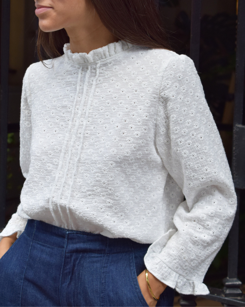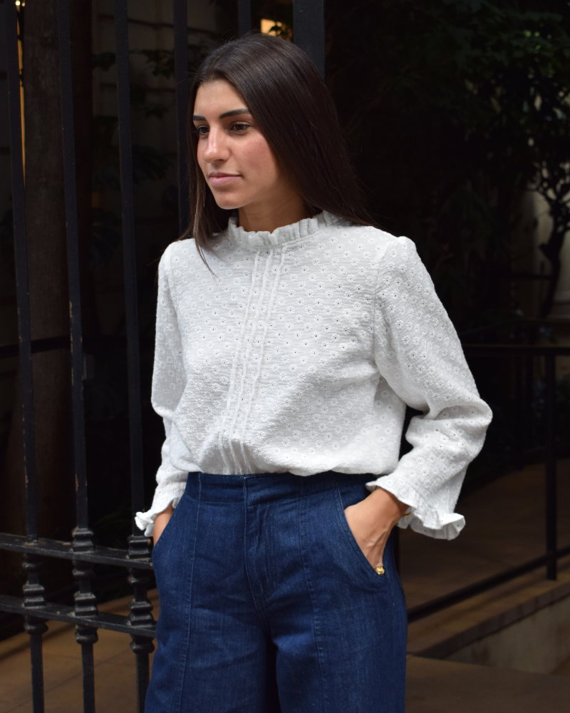White cotton shirt with embroidered flowers. Ruffles on the collar and sleeves, with three pleats running from the collar to the bottom. Buttoned at the collar.