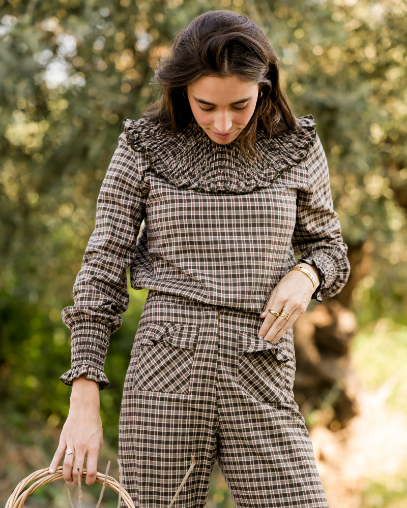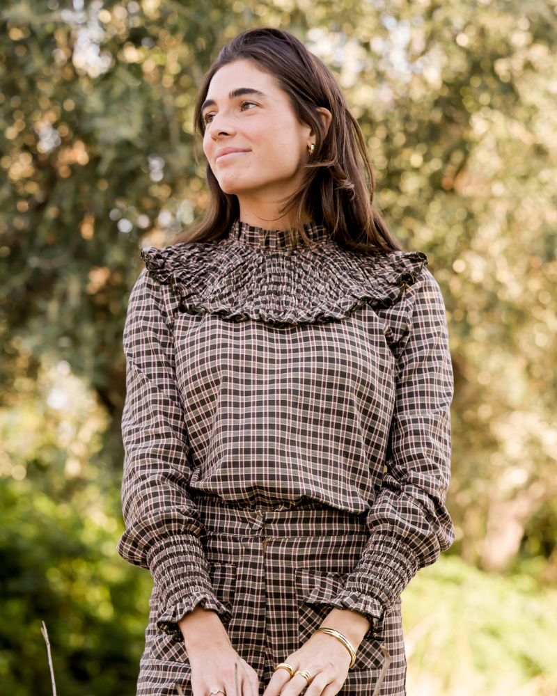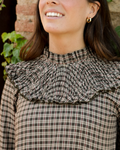 Green and maroon tartan print cotton shirt. High round collar with ruffle and half-moon honeycomb gathering across the chest. Fastens at the back with covered buttons. Slightly puffed sleeves with gathered cuffs. Ideal for pairing with your office looks (with our skirt or pleated trousers), your more casual looks (with jeans and Mary Janes) and even your evening looks with a pair of statement earrings.