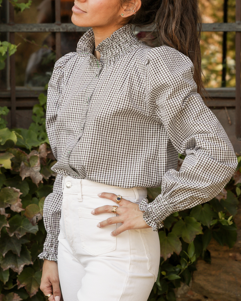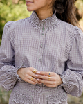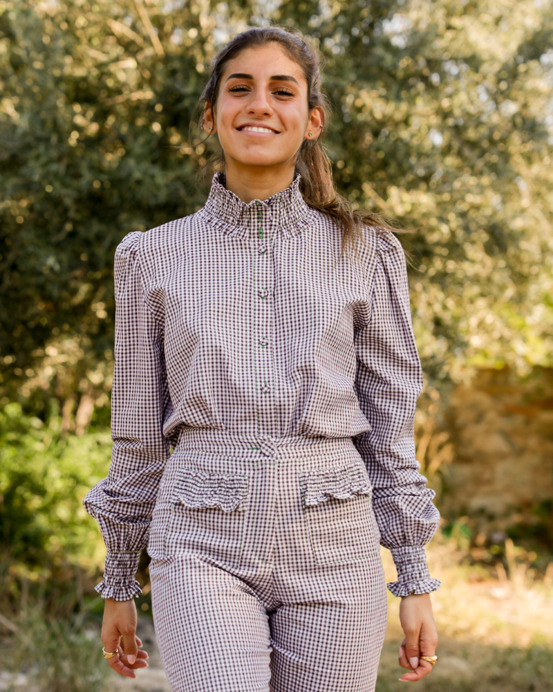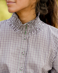 Green and brown checked cotton shirt. High neck with gathered finish. Buttoned from top to bottom with covered buttons. Long sleeves with gathered shoulders and cuffs with button fastening.