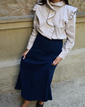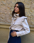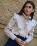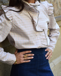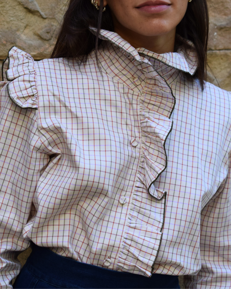 Organic cotton fabric shirt in white with green, lilac, maroon and red checks. Ruffle collar that goes down all the buttons. Long sleeves with ruffle at the shoulder and finished with buttoned cuffs.