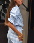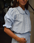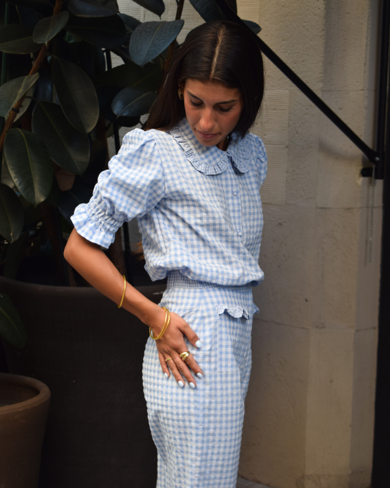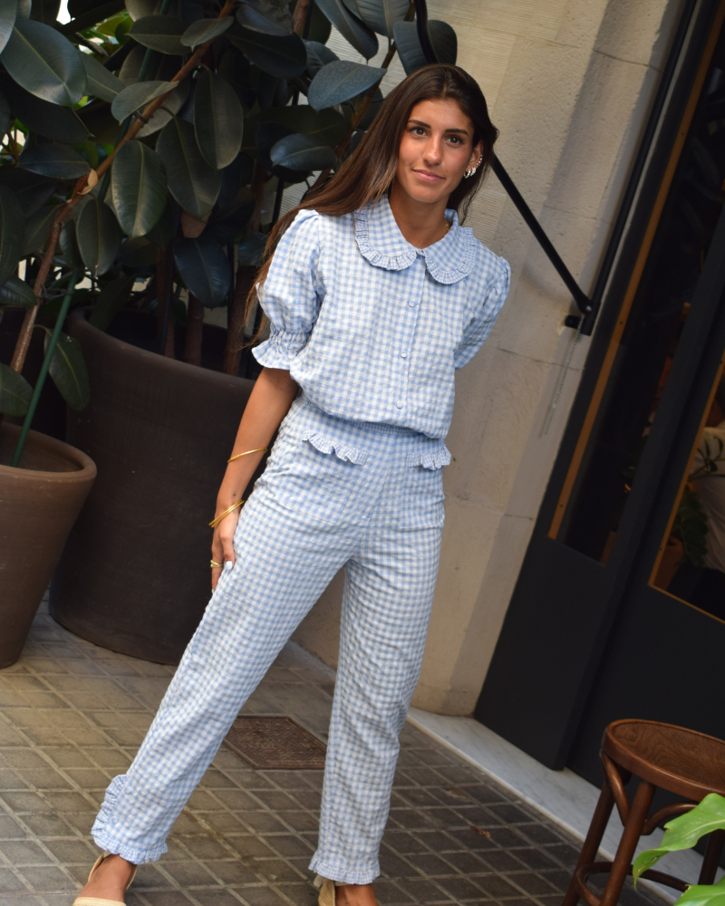 Shirt in sky blue vichy fabric. Buttoned from top to bottom with covered buttons. Small baby collar with ruffle finish. Short puffed sleeves with ruffled finish.