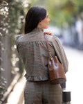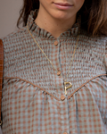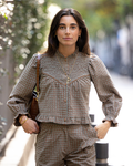 Shirt with turquoise and camel gingham print. Gathered chest and slightly cropped cut that reaches the waist. Buttoned from top to bottom. Long puffed sleeves with elastic and ruffles at the cuffs. Matching camel velvet details.