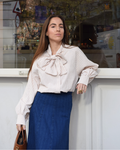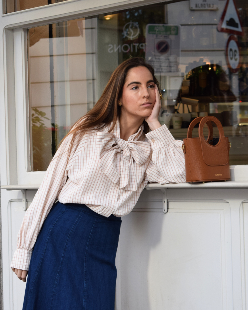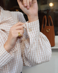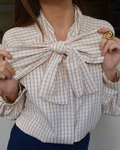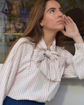 Light camel check print shirt buttoned from top to bottom. Collar with front tie. Puffed sleeves finished with cuffs that fasten with a button.