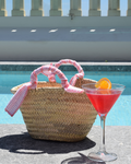 Hand-woven basket with natural palm and short handles lined with pink and white vichy mini fabric. Embroidered initials on one end of the handkerchief that lines the handle. Choose your favourite colour and personalise it just for you.