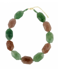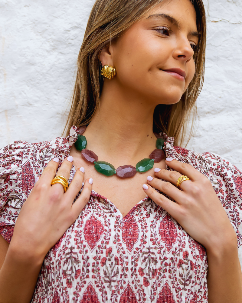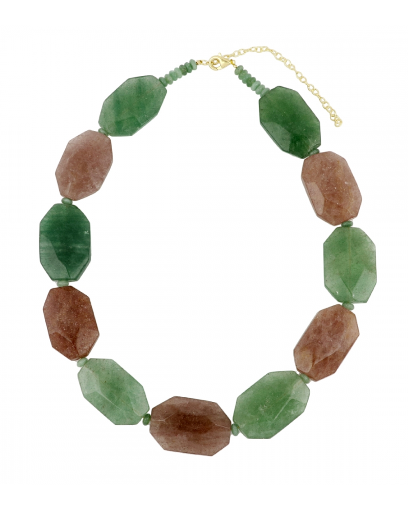 Necklace made of natural mineral stone in the shape of an octagon combining strawberry quartz and green quartz.