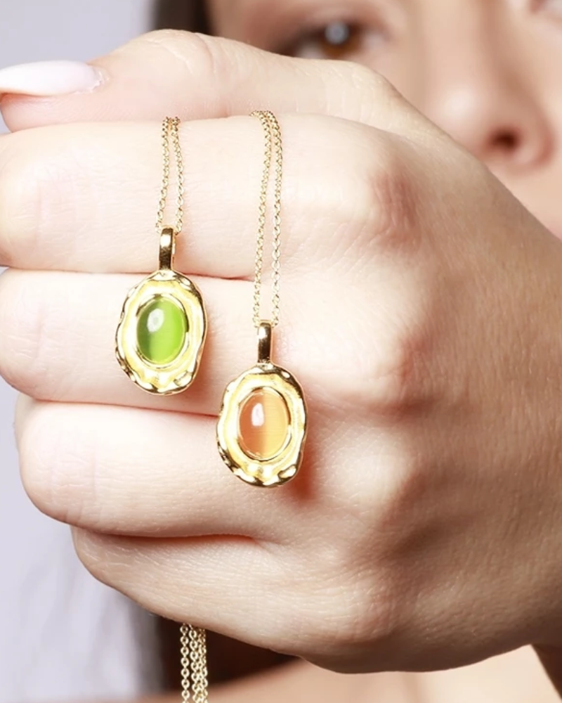 Wear it as a statement piece over open necklines or combine it with finer chains to create elegant layering. Ideal with neutral tones, whites, or earth tones to highlight the stone's color.