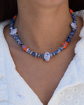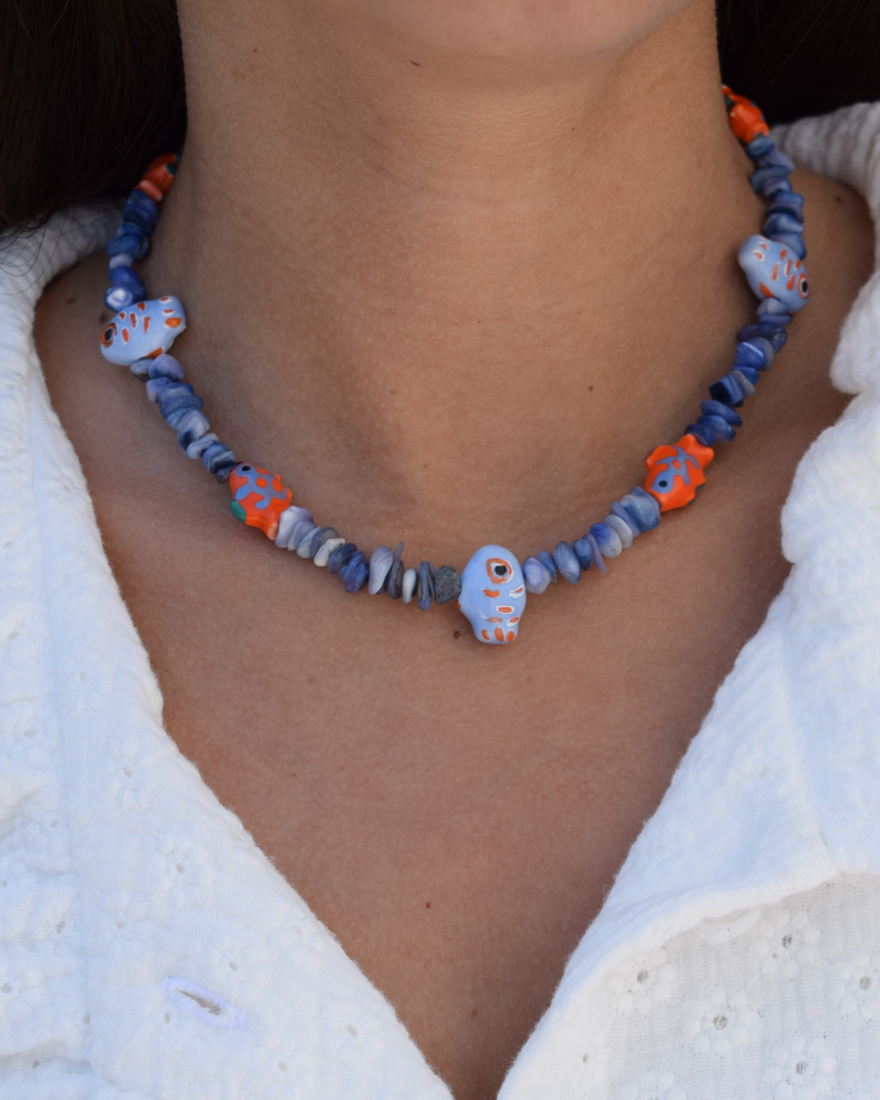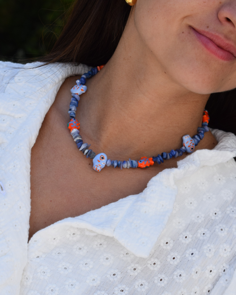 Sodalite necklace with ceramic charms of blue fish and orange fish.