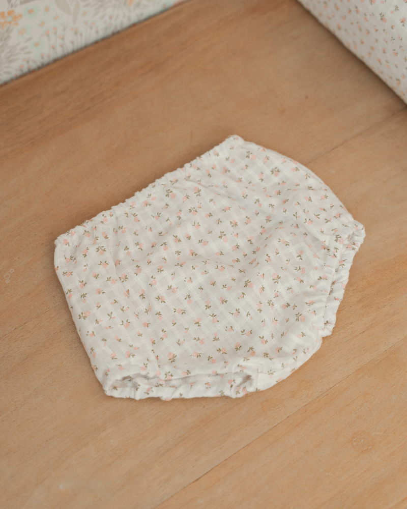 The Flower Nappy Cover is a nappy cover for babies, designed to provide maximum comfort, freedom of movement and a romantic touch to little ones’ outfits. Its design, featuring soft elastic at the waist and legs, creates a lovely puffed-up silhouette, fitting perfectly over the nappy without constricting the baby’s delicate skin.