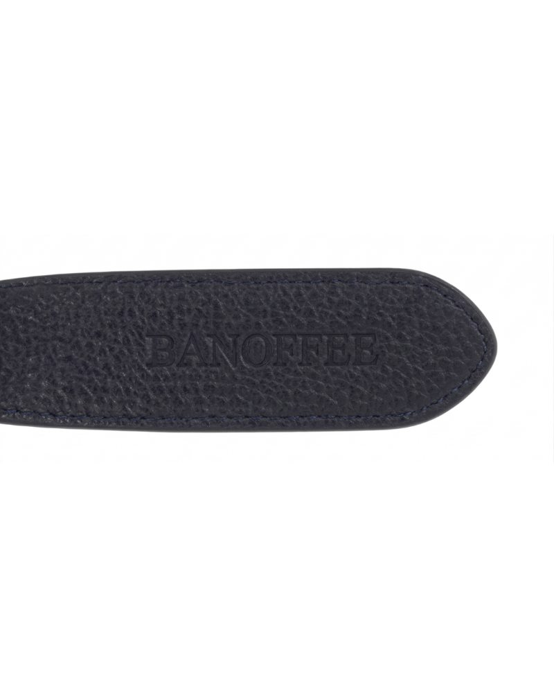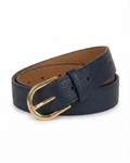 A versatile, practical and timeless belt. Crafted from leather with a textured finish in an elegant and understated navy blue shade, it stands out thanks to its classic gold buckle with rounded lines. The perfect accessory to add a touch of style to your jeans, pleated trousers or dresses.