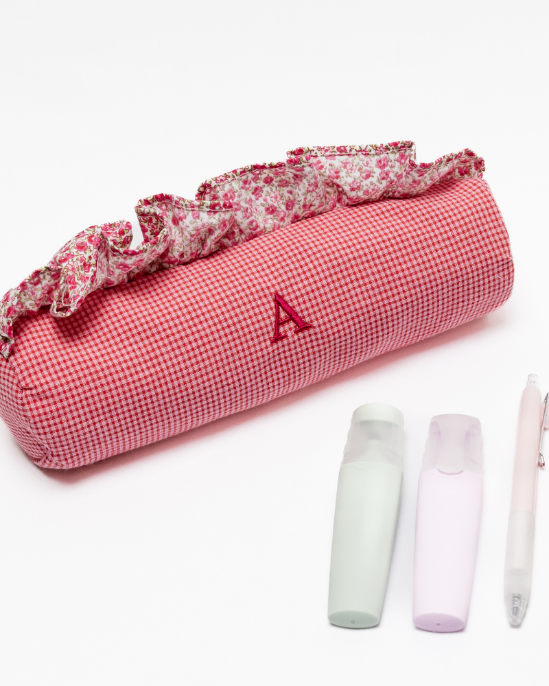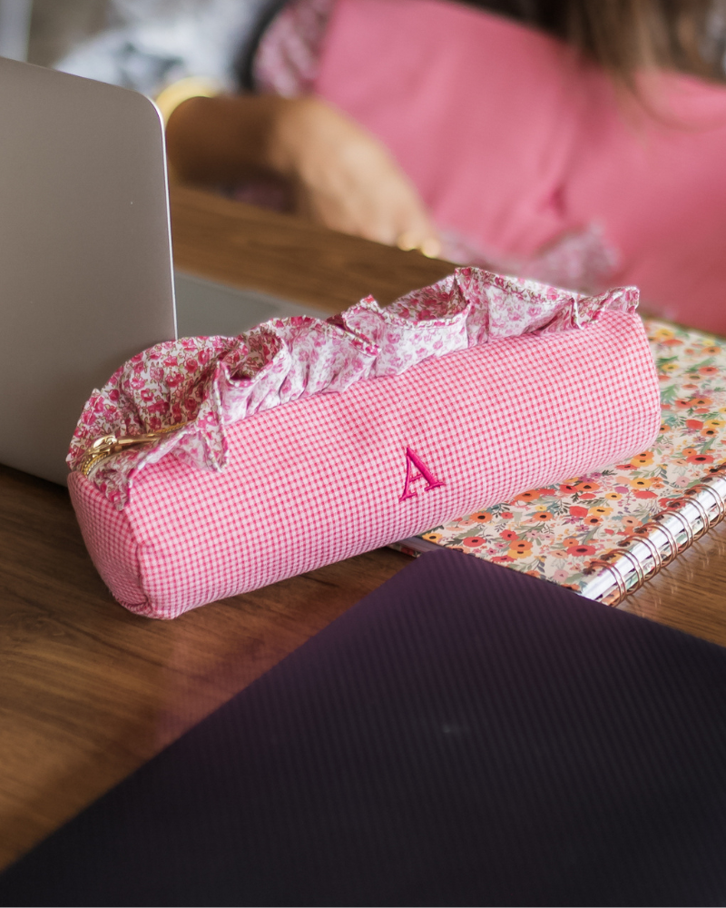 Fuchsia mini gingham fabric case. The sides of the zip feature a fuchsia floral print ruffle.