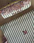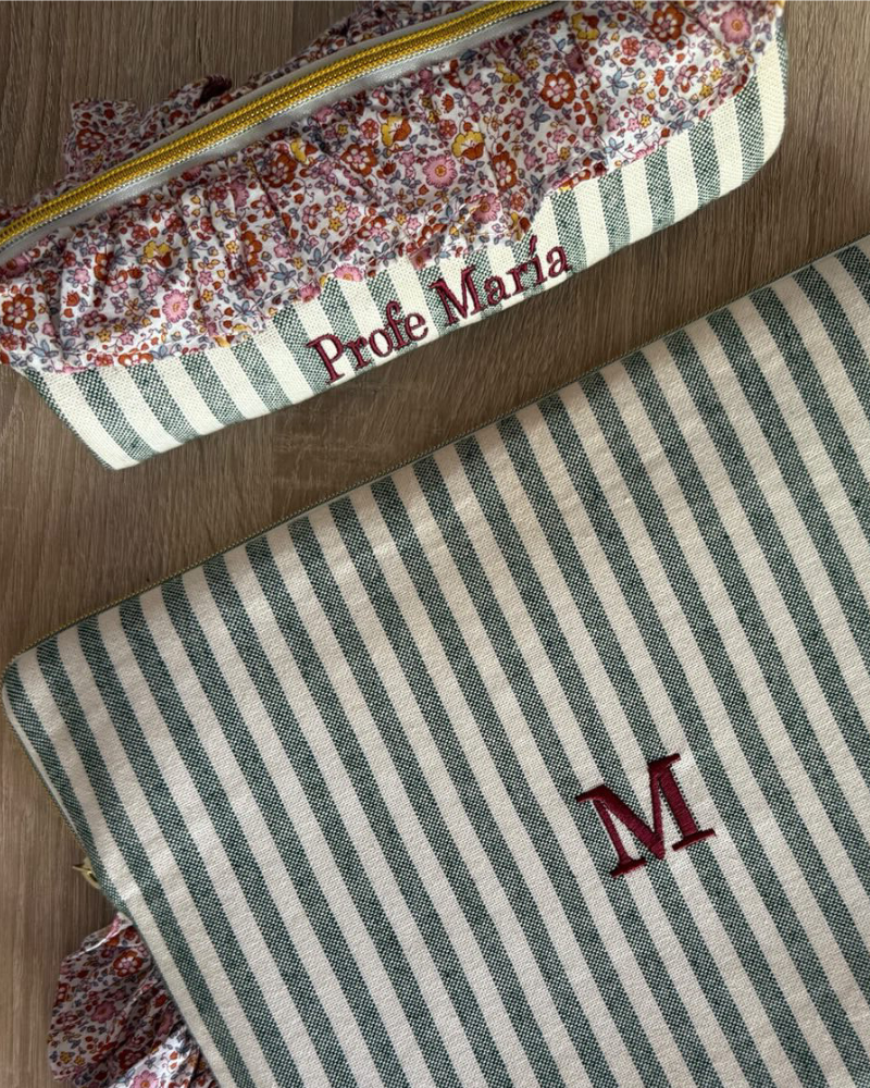 Case with fine green stripes. On either side of the zip, there is a ruffle with a red floral print.