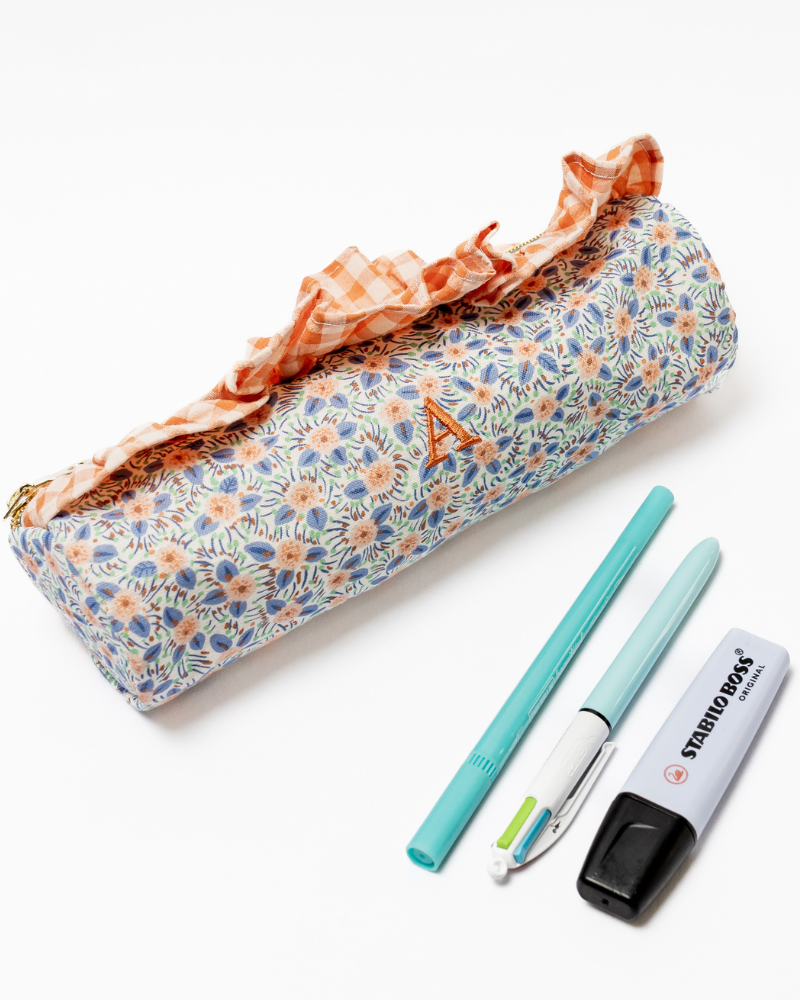 Case with floral fabric in shades of orange and blue. On either side of the zip there is a ruffle with a gingham print in shades of orange.