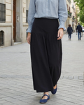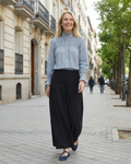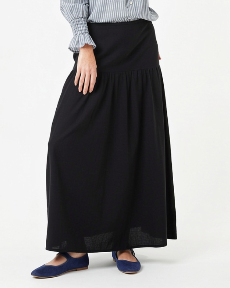 Full skirt in navy blue corduroy. Features a yoke at the hip, which adds structure and enhances the silhouette, ensuring a flattering fit. Adjustable elastic waistband.