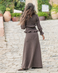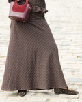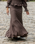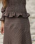Long, full skirt in brown fabric with beige checks. It features a yoke at the hip, which adds structure and enhances the silhouette, ensuring a flattering fit.