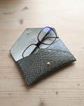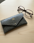 High-quality calfskin glasses case in crocodile brown. Design with flap and gold button closure.