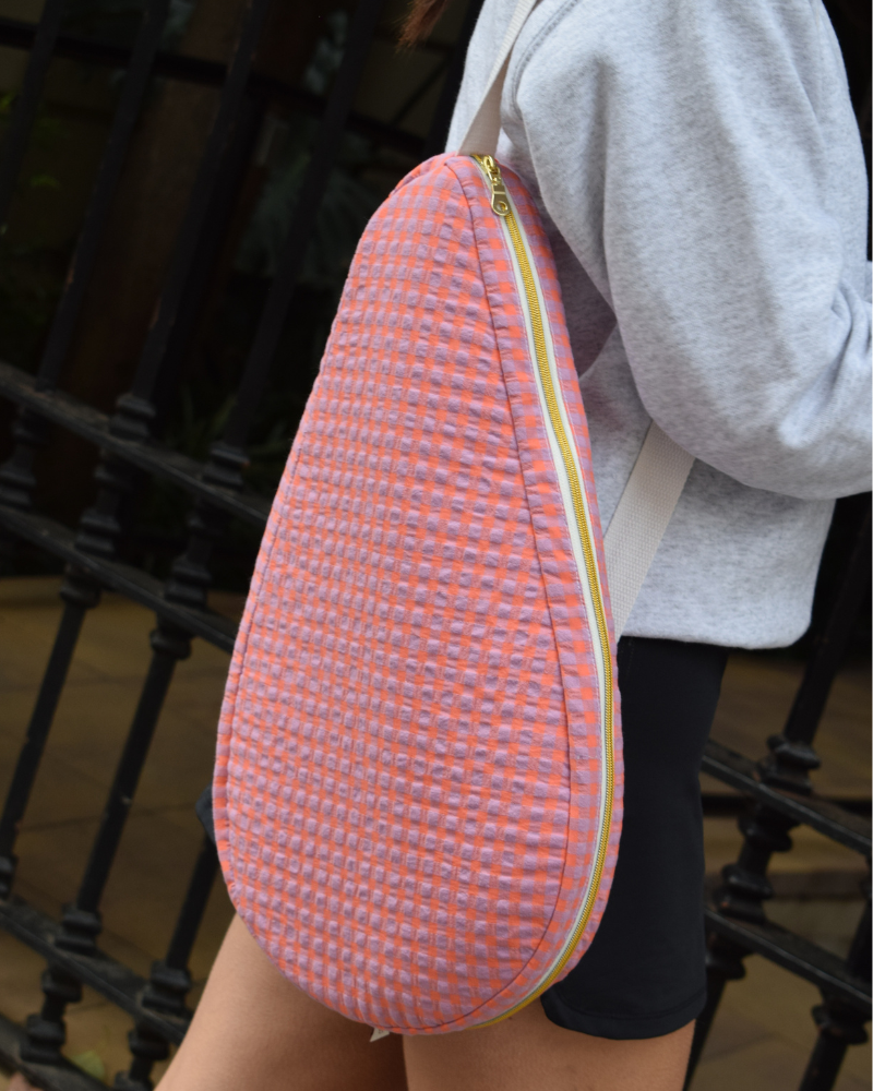 Orange and lilac vichy cotton fabric cover for padel racket. Lined with ecru fabric, it has protective padding so that your padel racket is always protected. Closes with a zip. It also has space to carry personal items.