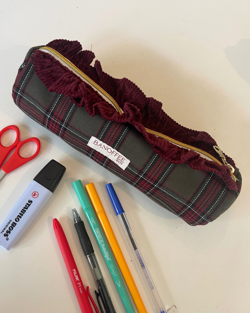 Personalised tartan fabric cover. Plain tartan fabric front and back. The front features a flap surrounded by a maroon corduroy frill.
