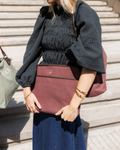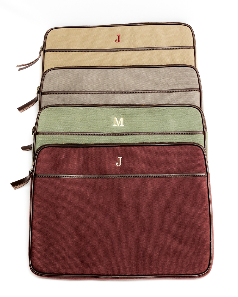 Personalised maroon canvas cover with chocolate brown leather details. Features an exterior pocket. Lined with ecru fabric. Gold zip with pull tab.