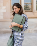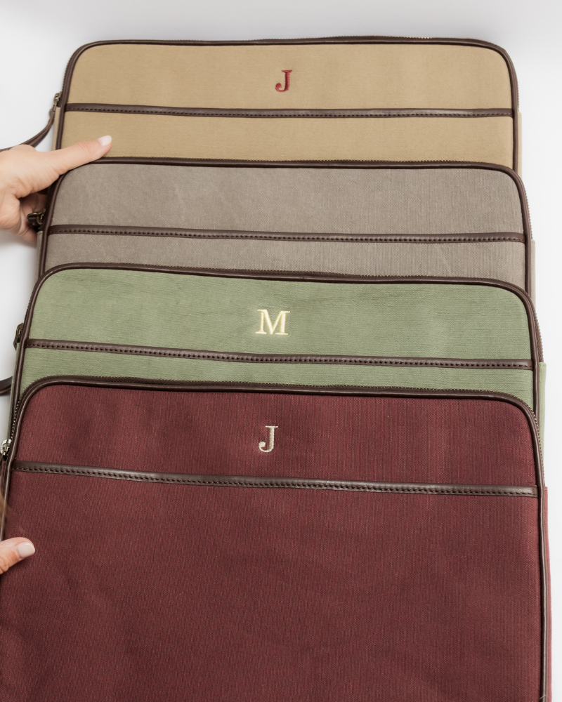 Personalised kaki canvas cover with chocolate brown leather details. Features an exterior pocket. Lined with ecru fabric. Gold zip with pull tab.
