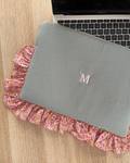 Personalised green fabric case with flower ruffle. Front back and plain back in green fabric.