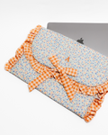 Personalised cotton fabric cover with small flowers in shades of blue and orange. Plain front and back in fabric with small flowers in shades of blue and orange. The front features a flap surrounded by an orange gingham frill and a matching bow.