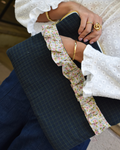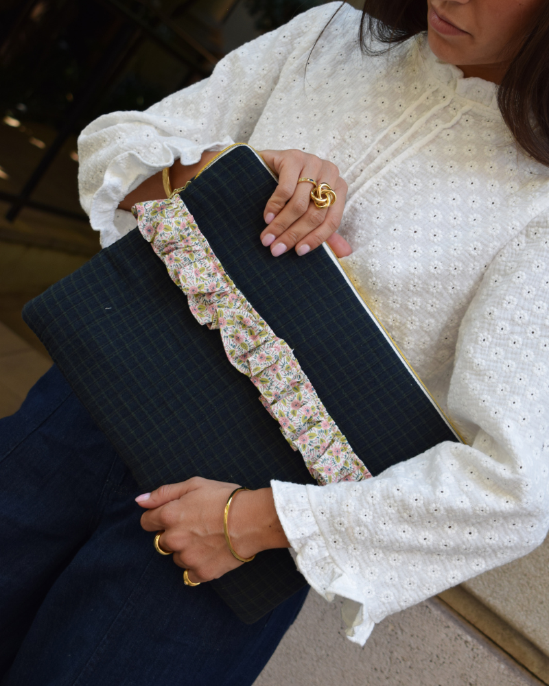 Personalised navy blue canvas bag with green checks. Front with two pockets with flower ruffles and plain back.