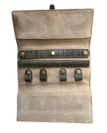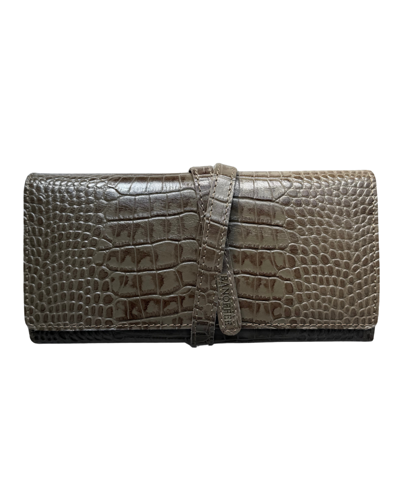 Rigid taupe cowhide jewelry box with crocodile embossing. Fastens with two straps. Taupe suede interior with two pockets (one with a zipper), two straps (one for rings and one for earrings), and various hooks for necklaces. Designed and produced in Barcelona.