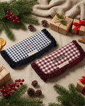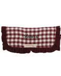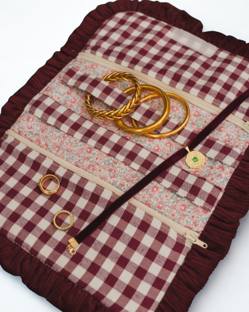 Maroon gingham travel jewelry case with contrasting fabric interior. Maroon corduroy ruffle around the entire jewelry case. Velcro closure. Features two interior pockets at the ends. Also includes a bar for rings and a strap for earrings.