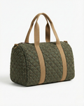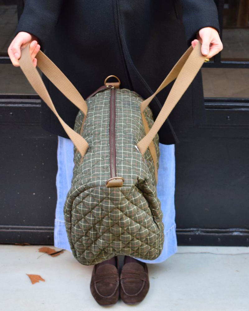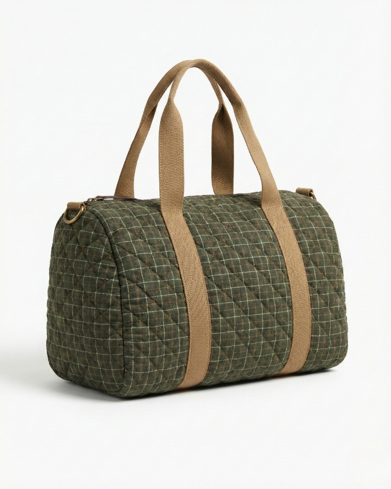 Made from green checked fabric with padding, it features short handles and a matching light camel canvas shoulder strap.