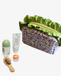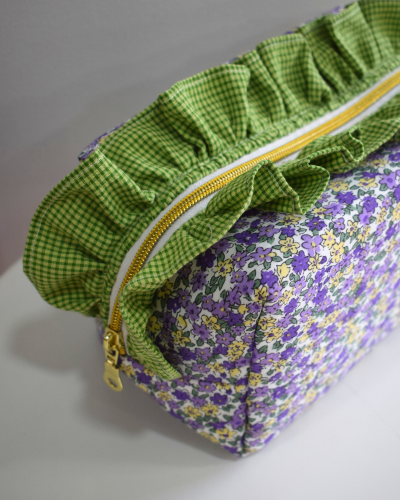 Small floral fabric bag in shades of purple with beige lining. With a mini gingham ruffle around the zip in shades of green.