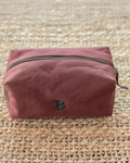 Canvas fabric toiletry bag with beige interior lining. Zipper closure. It has an exterior handle on the side in chocolate brown leather.